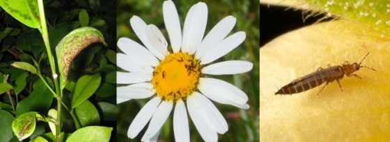 薊馬蟲體大小不超過5公釐,有細長的透明翅膀,幼蟲體呈淡黃色,成體呈褐色,有不對稱之口器。寄主範圍很廣,像是蔬菜類、糧食作物及花卉作物都可發現其蹤跡,喜愛藏匿於花器、葉皺摺與樹皮縫隙等隱密的部位,不易發現,主要吸食植株的果實、花器及葉片,甚至嫩芽或果莢都可能受害,葉表受害部位呈黃褐或灰白,於植株上也可見許多黑色排泄物,以榕薊馬為例還會造成葉片捲曲變形,但大多數都是以為害花部為主。